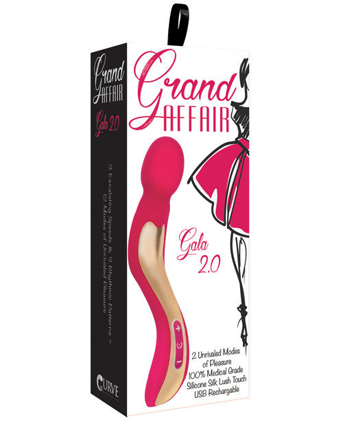 Experience the unrivaled pleasure of advanced technology with the Grand Affair Gala from Curve Novelties. This high intensity, ultra-powerful, rechargeable massaging wand is slime and lightweight for easy positioning. Includes 7 incredibly powerful modes of vibration and pulsation, and 4 toe-curling escalating speeds. Soft, satin storage pouch included. 100 percent waterproof. Made from silicone (massager) and ABS with metallic finishing (controls). Measurements: 8.5" X 1.5".