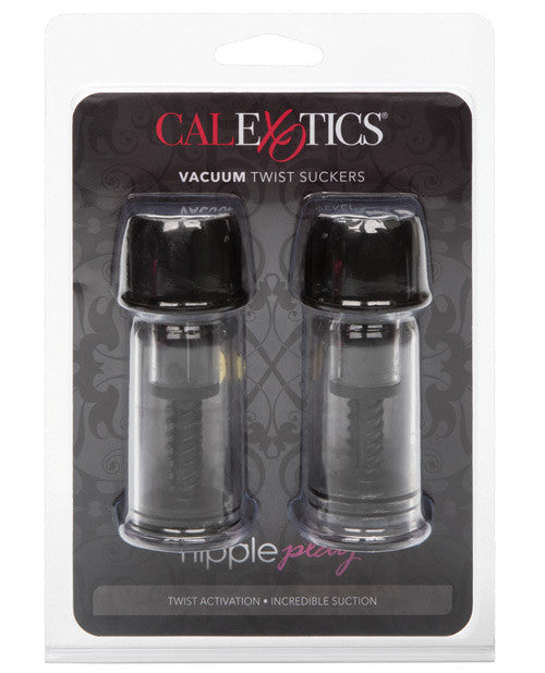 Enjoy powerful suction with this pair of powerful suction cylinders. There's nothing hotter than a sexy pair of nipples standing at attention. Or maybe your nipples are feeling a bit inadequate, perhaps it's time to give them a good suck and add some kink with the Cal Exotics Nipple Play Vacuum Twist Nipple Suckers. These nipple pumps use a unique vacuum pressure design that you simply twist to adjust suction for increased sensitivity. Sensitize those nips while getting a full hands free view of them. The Cal Exotics Nipple Play line of toys are made of high quality materials that are phthalate free and waterproof. For a better seal use your favorite Water Based Lubricant. Color: Black, Clear Materials: AS (cylinder), ABS Plastic(cap, plunger), Silicone (seal) Length: 4 inch Insertable Length: 1.5 inch Width: 1.5 inch(overall), 1.3 inch(internal)