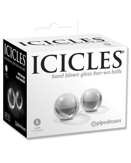 The Icicles Hand Blown Glass No. 41 from Pipedream. Elegant, upscale, and hand-crafted with amazing attention to detail, these luxurious glass Ben-Wa balls are made from borosilicate glass and designed to last a lifetime. Their size and weight make them perfect for vaginal stimulation and exercise use, and the nonporous glass is hypoallergenic and body safe. With regular use, you'll enjoy improved muscle control and stronger, more frequent orgasms. Run them under warm water or place them in the microwave to heat things up. Chill them under cold water or put them in the freezer for a cool sensation. Cleanup is a snap after the fun with Pipedream toy cleaner and warm water. Small: 1" (25mm).